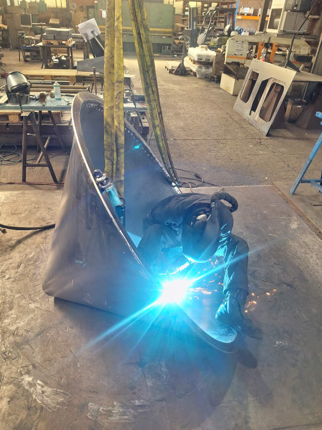 3. Fertigung: Umformung an Abkantpressen, Qualitätsprüfung an der Werkbank, Kontrolle der Genauigkeit.